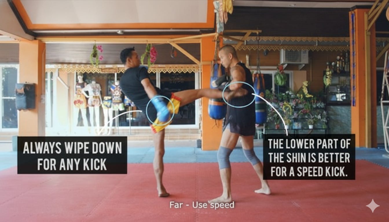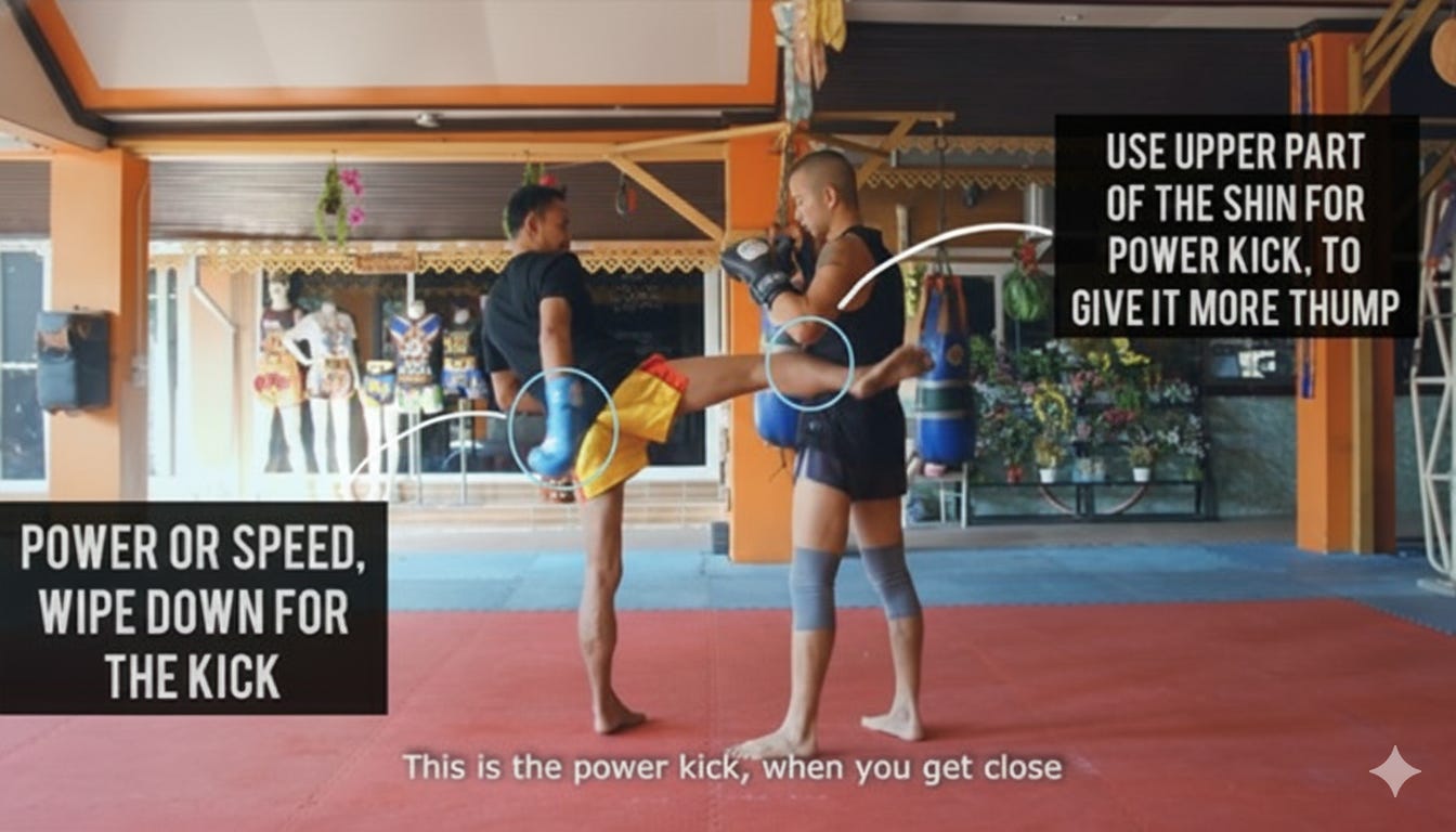 Watch Lerdsila and Saenchai fight. Notice how he adjusts his range constantly. When he’s on the outside, he’s extending fully—striking with the lower shin, the toes, maximizing velocity and reach. The leg whips rather than clubs.