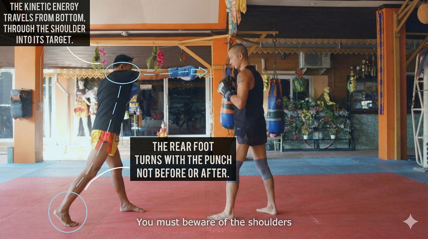 Watch Pipa throw a cross. The power doesn’t originate in his shoulder—it originates in his rear foot. The force travels upward through his leg, explodes through his hip rotation, transfers cleanly through his core, and arrives at the target through his fist.