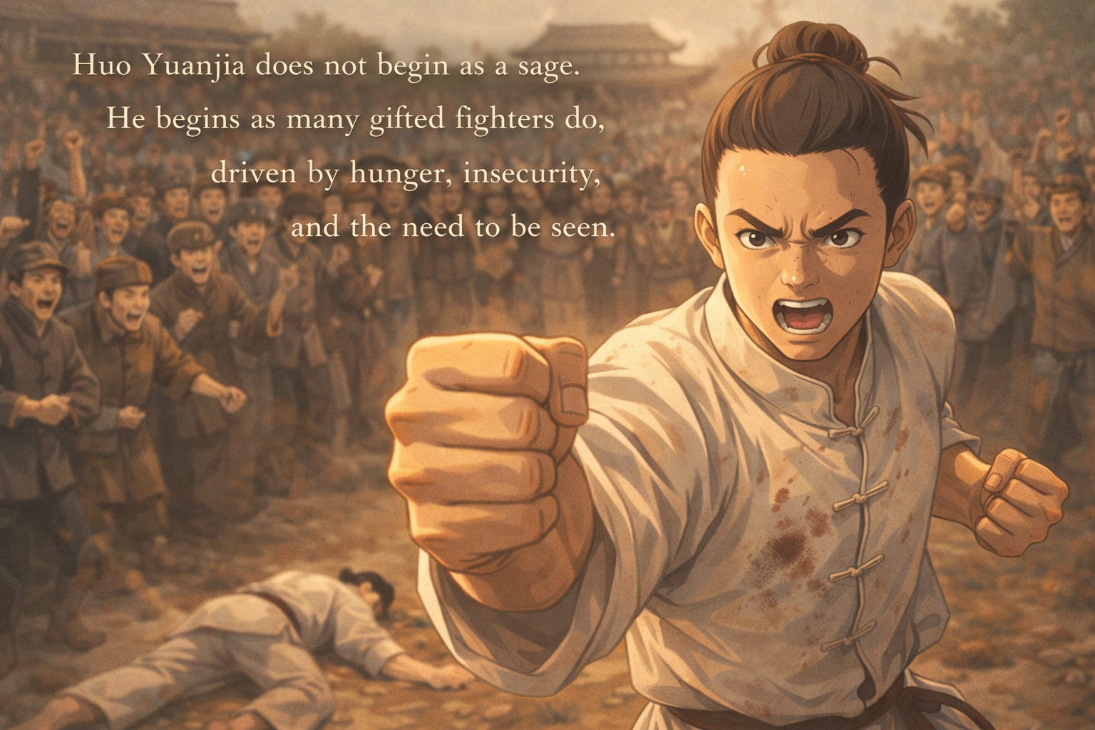 Huo begins as a talented but insecure young fighter who is forbidden by his father to train. Driven by a need to prove himself, he trains in secret and eventually becomes an exceptional martial artist. As an adult, he challenges and defeats other fighters in public matches, quickly earning a fearsome reputation. His victories bring fame, wealth, and admiration, but they also bind his identity entirely to winning.