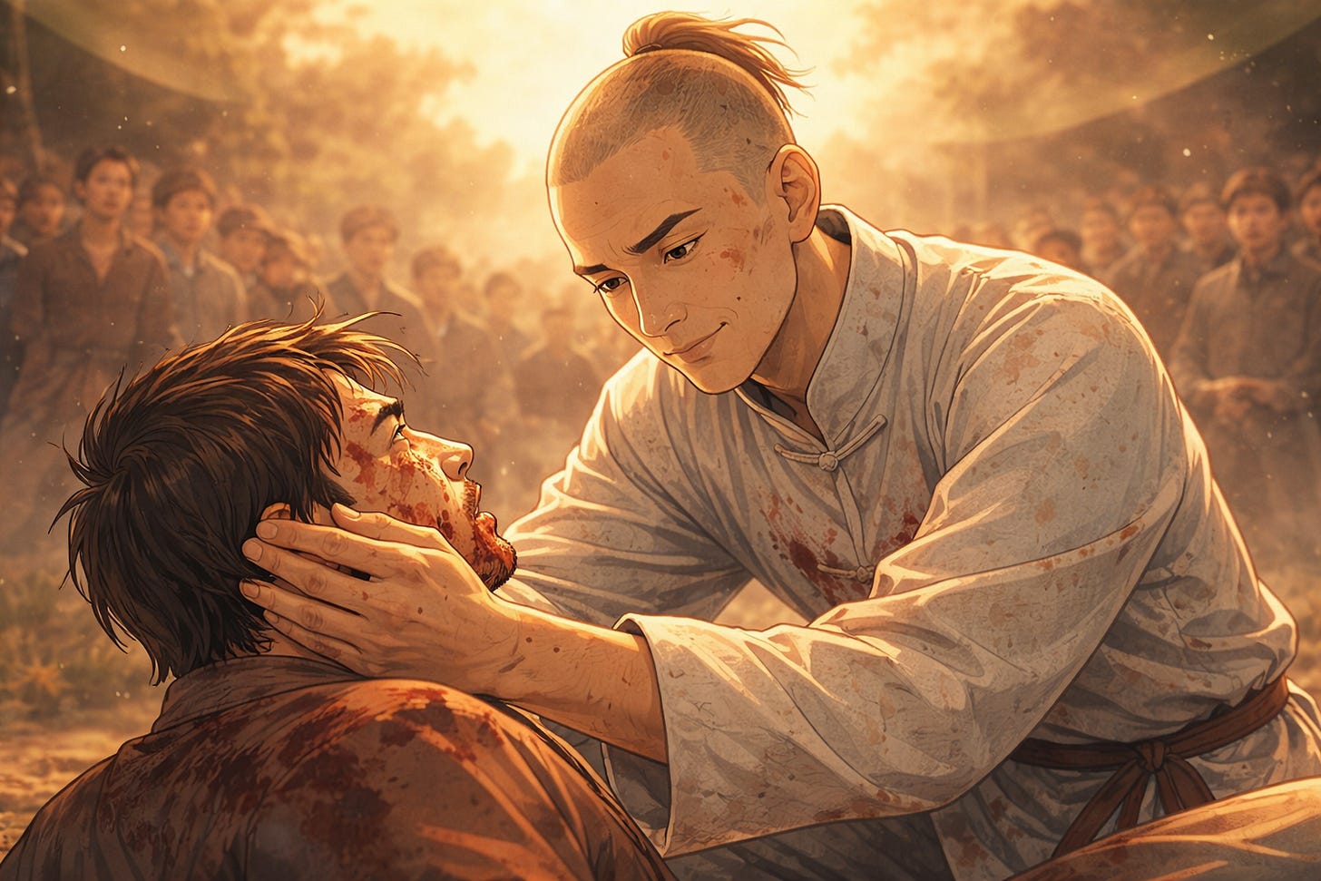 Knowing he is dying from getting poisoned, knowing the outcome no longer belongs to him, Huo refuses to let victory become cruelty. Even in his final moments, he could end the match decisively.