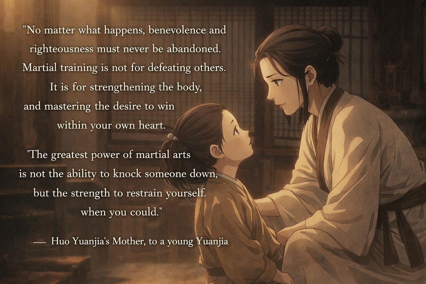 Everything that follows in Fearless is not a discovery of new truth, but a long and painful return to this original teaching. Huo spends his life learning through consequence what his mother already knew through understanding.